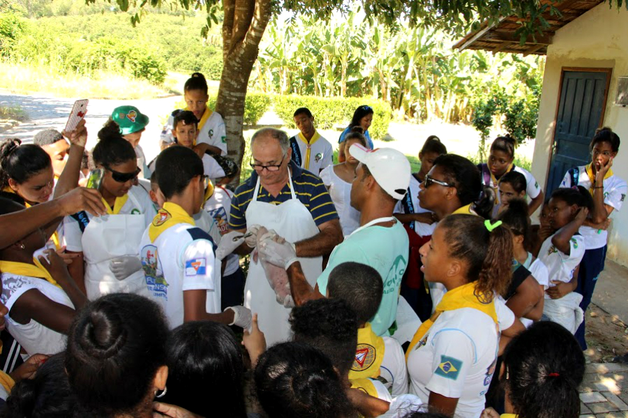 O zootecnista Columbino Teixeira auxiliou o grupo em atividades práticas com leitões.