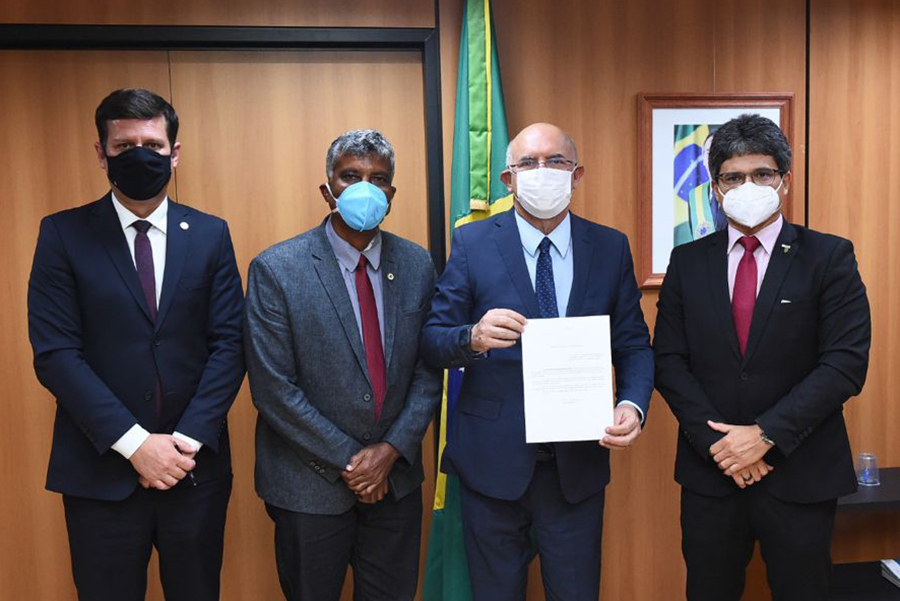 Da esquerda para a direita, o secretário da Educação Profissional e Tecnológica, Tomás Dias Sant'Ana; o diretor de Implantação do Campus Itaboraí, Vicente Oliveira; o ministro da Educação, Milton Ribeiro; e o reitor do IFFluminense, Jefferson Manhães. (Foto: Divulgação)