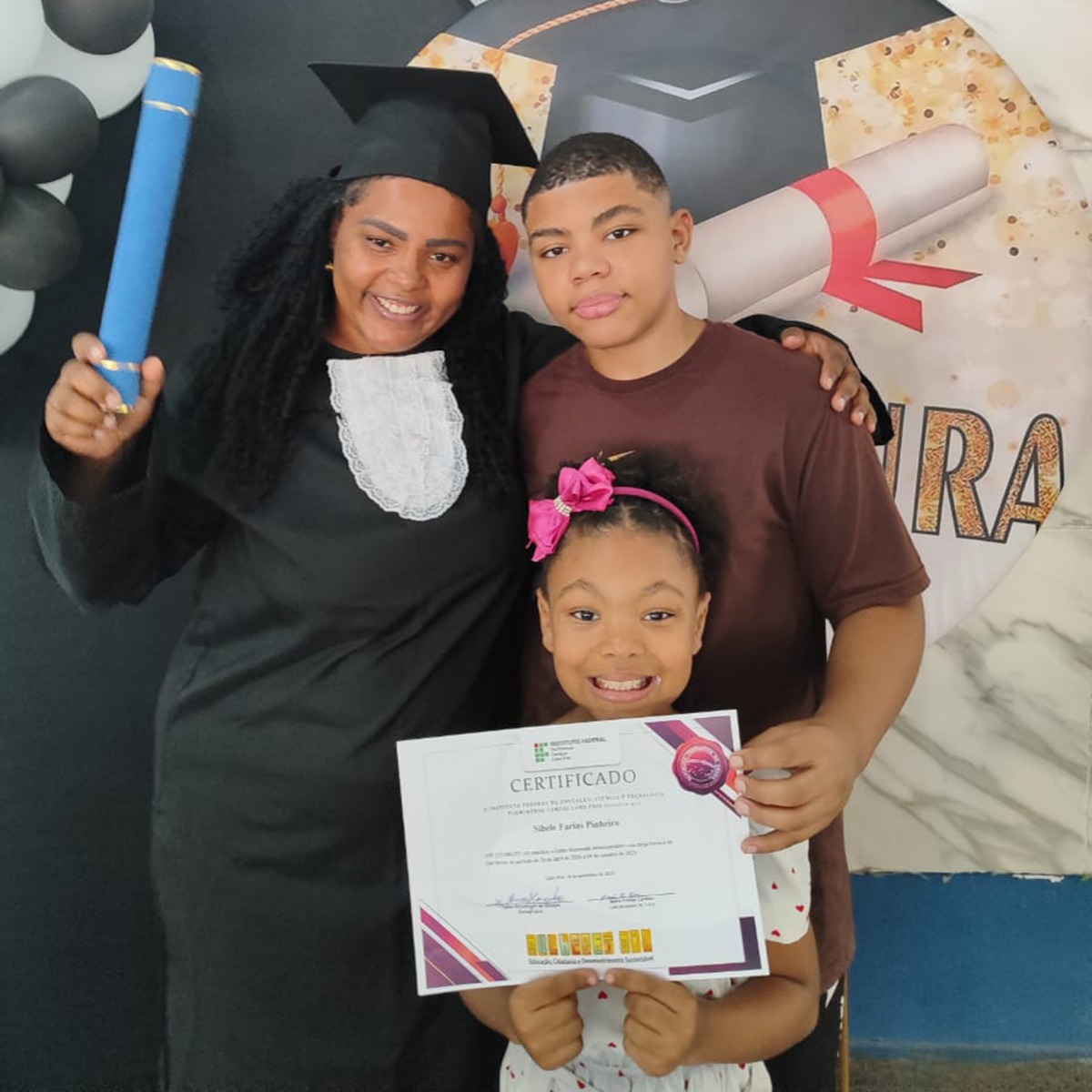 A estudante Sibele comemora a conquista ao lado dos filhos (Foto: Divulgação/IFF).
