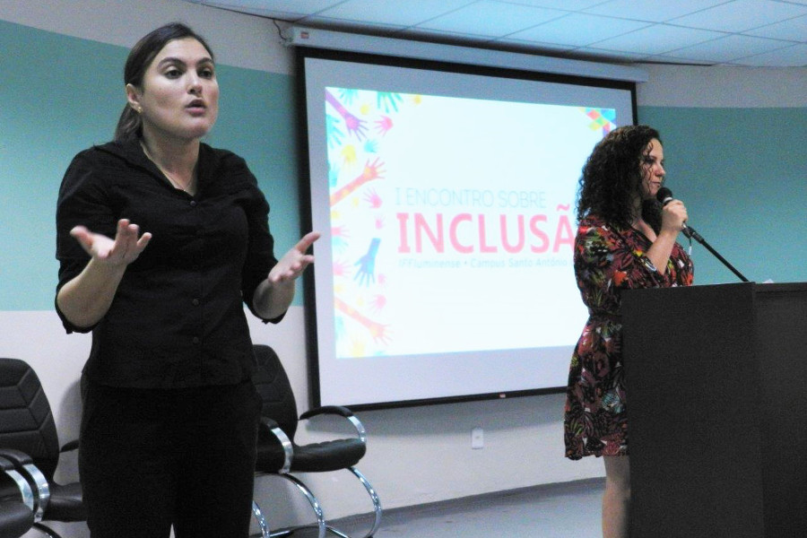 A intérprete de Libras Vívia Mery faz a tradução do evento.