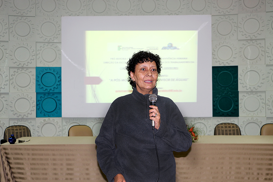 A professora aposentada Guiomar Valdez durante palestra para os novos servidores